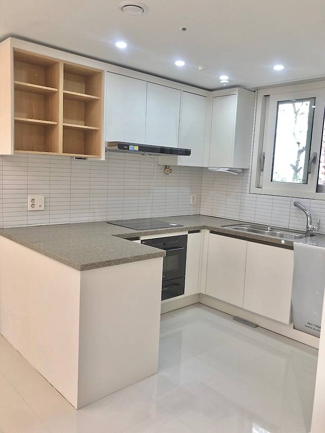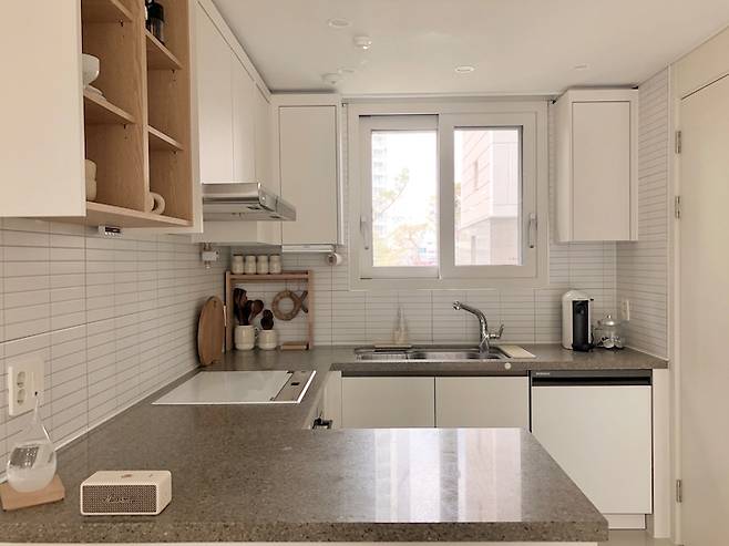 요리를 좋아하는 저로서는 사실 이 집의 주방이 너무 마음에 들지 않았어요. 저는 신혼 때부터 큰 주방을 꿈꿔 왔었거든요. 신혼 첫 집은 74타입에 타워형이라 주방이 좁았고, 두 번째 집도 평형이 좁다 보니 주방이 작았어요.