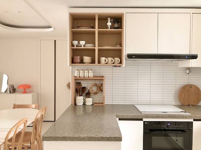 그렇게 고민의 고민을 하고 탄생한 주방이에요. 주방에 엔지니어 스톤을 너무 마음에 들어 하지 않는 저를 보고 인테리어 소장님이 그냥 서비스로 벽면 타일을 해주셨어요. (너무 감사합니다) 엔지니어 스톤 옵션비는 조금 아깝지만 그래도 우중충했던 주방이 조금은 더 밝아진 거 같아요.