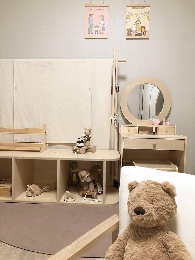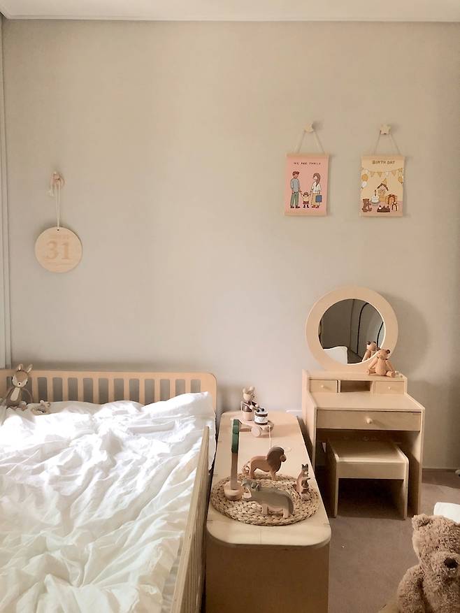 사실 저는 우드는 별로 좋아하지 않았는데 아이가 생기고 따뜻한 공간을 생각하고 만들다 보니 우드가 좋아진 거 같아요. 엄마 취향 가득으로 만든 아이의 방이지만 아이도 너무 예쁘다고 좋아해 줘서 다행이에요.