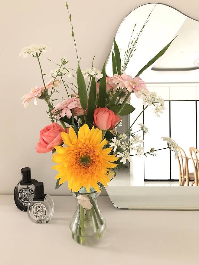 생화를 좋아하는 남편이 사 온 꽃으로 거실도 더 화사해졌어요. 글을 작성하다 보니 저희 남편이 많이 언급이 되는데 사실 오브제나 인테리어에는 저보다 저희 남편이 더 관심이 많답니다:) 제가 몇 가지의 소품을 골라 남편에게 보기를 주면 남편이 선택해서 주문을 하는 게 더 많아요.