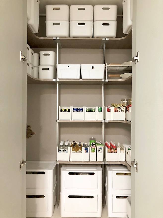보이지 않는 공간에는 나오면 지저분해 보이는 물건들을 넣어 문을 닫아주면 훨씬 깔끔하게 팬트리를 정리할 수 있어요.