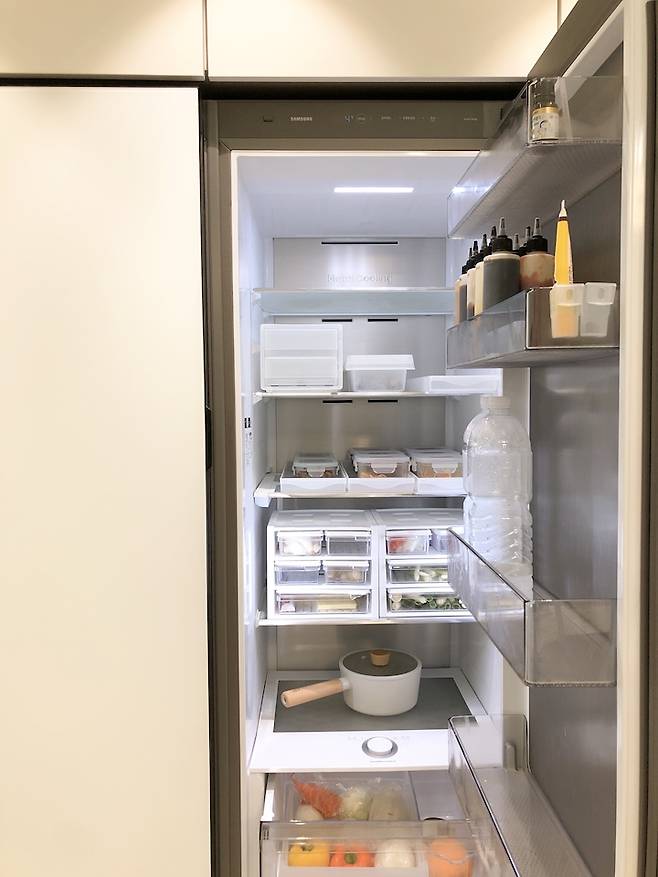 지저분해 보이는 소스류는 통일된 소스통에 넣어 보관하고, 보통 식재료는 그날 그날 필요할 때 사기 때문에 냉장고에 많은 식료품을 저장해 놓지 않아요. 요리를 하다 남은 식재료들은 한눈에 보일 수 있게 보관을 해두면 다음 날 먹을 요리 메뉴를 정하는데 편해요.