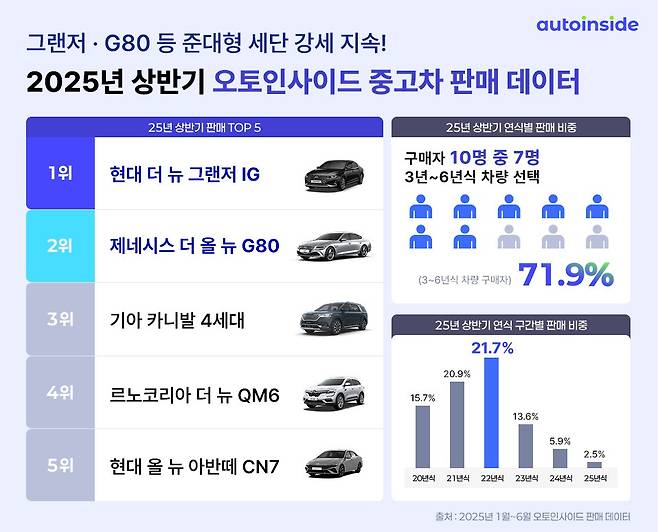 모빌리티 서비스 전문기업 오토핸즈의 직영 인증 중고차 플랫폼 오토인사이드는 2025년 상반기 중고차 판매 데이터를 분석한 결과 현대차 `더 뉴 그랜저 IG`가 지난 1분기에 이어 올해 상반기에도 가장 높은 판매량을 기록하며 중고차 시장 내 세단 선호 현상이 이어지고 있다고 16일 밝혔다.