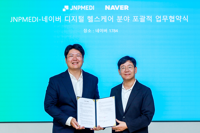 네이버㈜(대표이사 최수연)는 네이버 최인혁 테크비즈니스 대표, 제이앤피메디 정권호 대표 등 양사 관계자가 참석한 가운데 ‘네이버-제이앤피메디 디지털 헬스케어 분야 포괄적 업무협약식’을 진행했다.