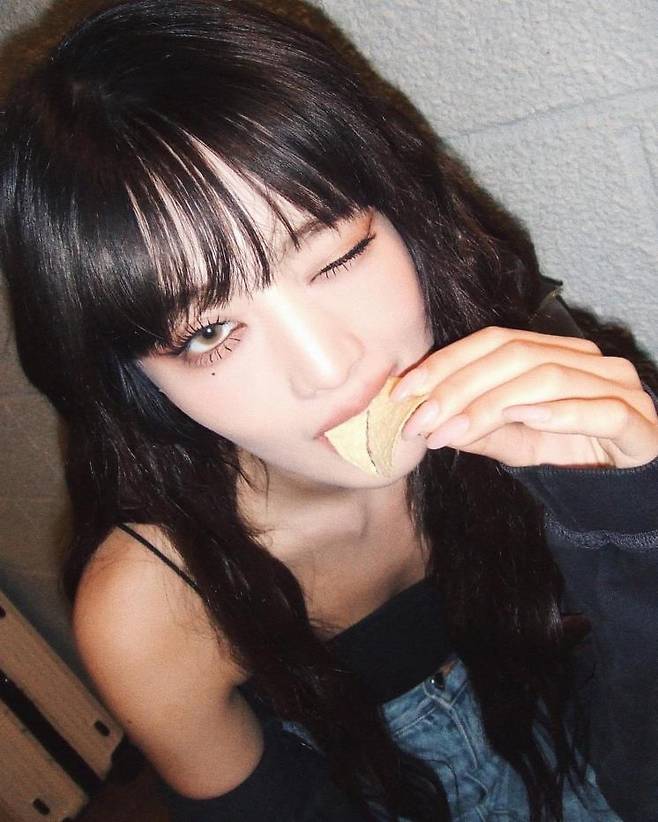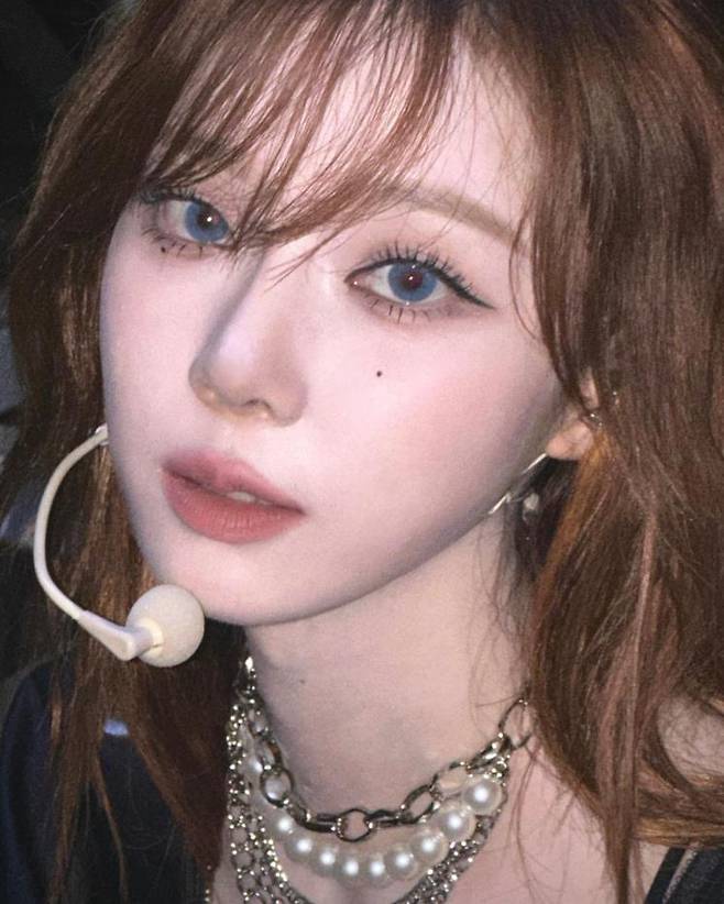 본인의 고유한 색깔이 있는 아이들민니. 밝은 렌즈와 스모키 화장에 오른쪽 눈 밑의 점이 매력적이고 신비로운 그녀의 매력을 더해줘요.