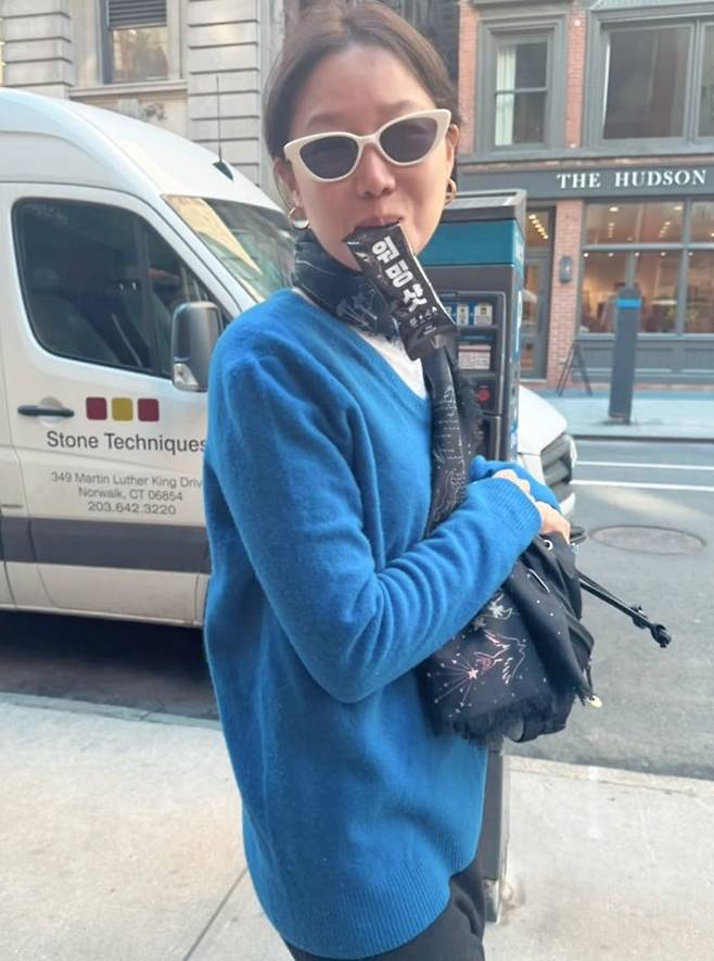 배우 공효진이 뉴욕에서 동네 마실 가듯 간편한 니트 스웨터만으로도 러블리한 스타일을 선보였다.