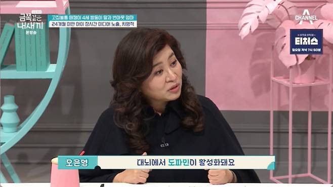 오은영 박사는 "만 2세 전에 동영상에 많이 노출되면 주의력 발달에 심각한 문제가 발생해 ADHD 원인 중 하나가 된다. 언어 발달에도 부정적 영향을 준다. 정서 발달에도 큰 문제다. 또 동영상은 자극적이라 몰입하다보면 대뇌에서 도파민이 활성화 된다. 시청을 중단하면 도파민 분비가 저하되고 이런 것들이 행위 중독이 된다. 당장 미디어 시처을 멈추셔야 한다"라 경고했다.