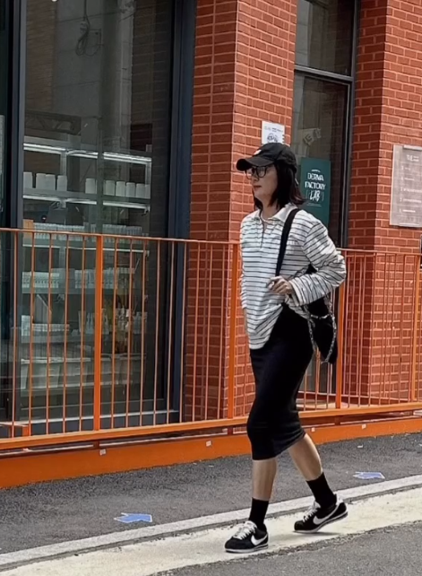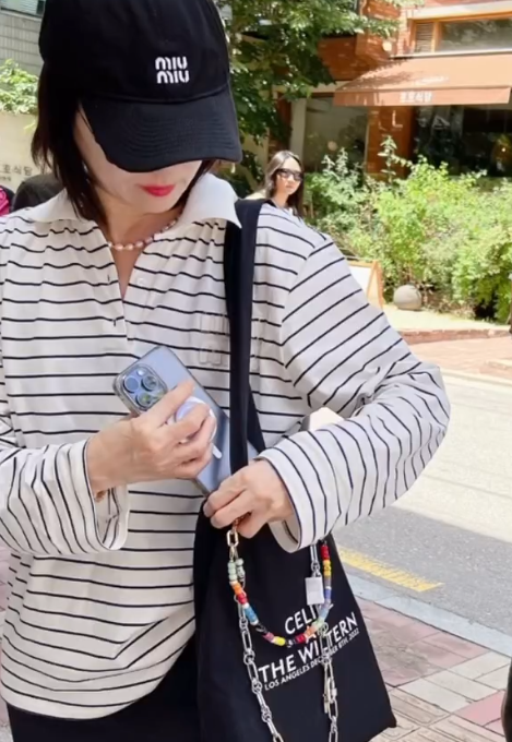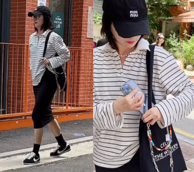 오연수는 줄무늬 스트라이프 티셔츠와 검정색 미디 스커트를 매치하여 캐주얼하면서도 세련된 룩을 선보였습니다. 에코백과 블랙 볼캡으로 편안하면서도 스타일리시한 포인트를 더했고, 검정색 운동화로 전체적인 룩을 깔끔하게 마무리했습니다.