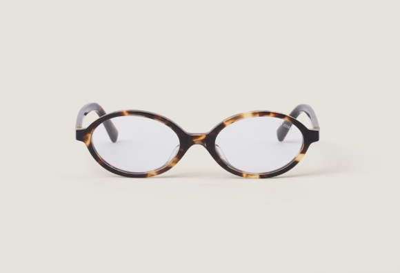 미우미우 국내 공식 홈페이지 기준으로 580,000원에 판매되며, 고급스러운 아세테이트 소재와 클래식한 타원형 디자인이 돋보인다.