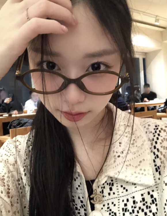 그녀가 착용한 안경은 이탈리아의 명품 브랜드 miu miu에서 출시한 "미우 리가드 선글라스"로, 유니크한 곡선미와 세련된 디자인이 돋보인다.
