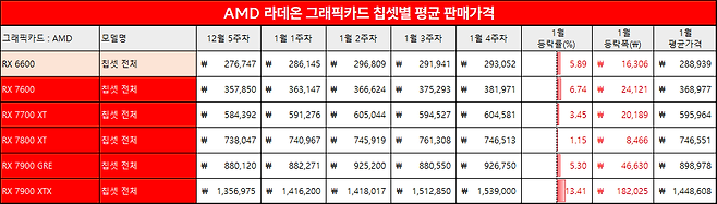 칩셋별 평균 판매 가격은 RX 6600(+5.89%), 7600(+6.74%), 7700 XT(+3.45%), 7800 XT(+1.15%), 7900 GRE(+5.30%), 7900 XTX(+13.41%)이며, 그 중에서 특히 7900 GRE, 7900 XTX는 3월 중 출시 예정인 RX 9070 시리즈로 대체될 가능성이 있으므로 지금 시점에 구매하는 것은 추천하지 않는다. 가성비로는 RX 6600과 7600이 그나마 괜찮은 편이고, 그 외에는 RX 7800 XT가 오픈마켓 행사를 끼고 풀리면 상품성이 좋다.