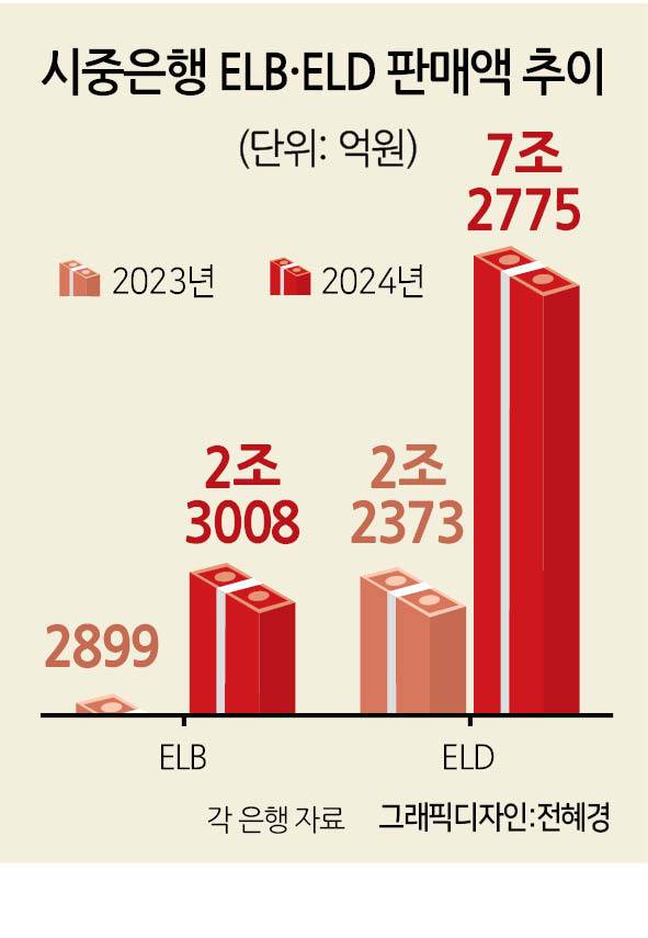 ELB와 같이 주가지수에 연동해 수익률이 정해지는 예금 상품인 ELD(주가지수연동예금)의 판매 규모가 커진 것도 같은 맥락으로 풀이된다. 지난해 신한·하나·농협은행의 ELD 판매 총액은 7조2775억원으로 2023년(2조2373억원)보다 3.3배 늘었다.