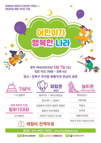 또 이날 오전 11시 ‘어린이인권선언 100주년’과 ‘어린이날 제정 101주년’ 기념식을 하고, 오후 2시에는 세계 어린이인권 말하기대회도 열린다.
