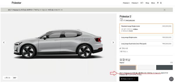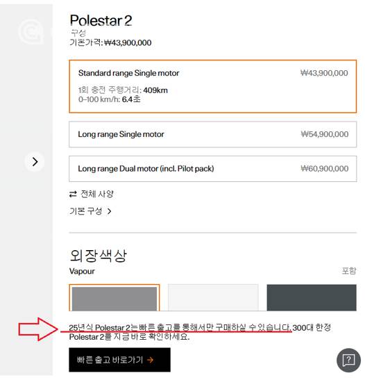 폴스타는 테슬라와 마찬가지로 홈페이지를 통한 온라인 구입만 가능하다. 스탠다드 레인지 싱글 모터 모델의 경우 저렴한 실 구입가를 제공하면서 300대 한정이라는 조건을 붙이면서 심리적으로 빠른 선택을 유도하고 있다. 그런데 홈페이지에서 '구입하기'를 진행해 보니 홍보와는 다른 점이 엿보였다.