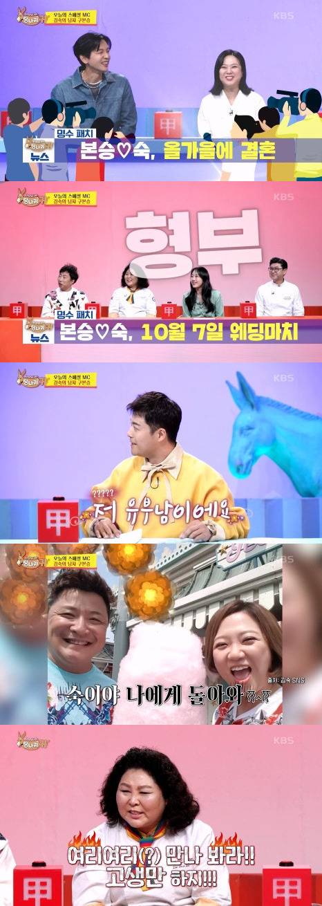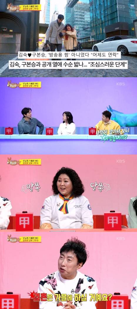 지난 방송에서 구본승은 김숙 옆자리에 앉아 “보조개가 더 잘 보인다”며 다정한 멘트를 건넨 바 있다. 박명수는 두 사람을 향해 “결혼은 10월에 해라”고 말해 주변을 웃게 만들었다.