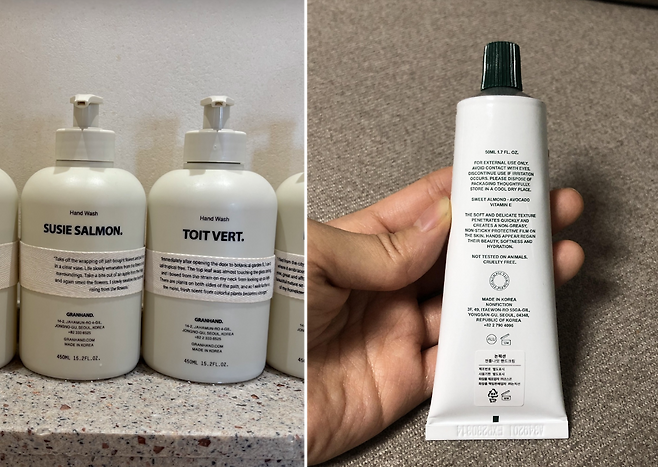 향수, 핸드크림, 인센스, 디퓨저 등 향 제품을 판매하고 있는 ‘그랑핸드’도 마케팅을 위해 영어를 과하게 사용한다는 지적을 받고 있다. 해당 브랜드의 경우 향 제품을 주로 판매해 상세한 설명이 필수다. 하지만 해당 브랜드에서 판매하고 있는 대부분 제품에는 탑노트, 미들노트, 베이스노트를 비롯한 모든 향을 영어로 설명하고 있다.