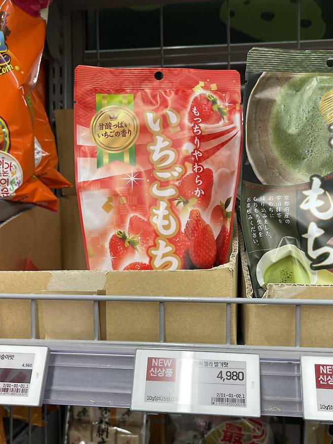 부드럽고 쫀득한 찹쌀떡 질감에, 과즙 베이스의 상큼하고 달콤한 딸기맛 크림 또는 젤리 필링이 조화된 디저트형 모찌에요.