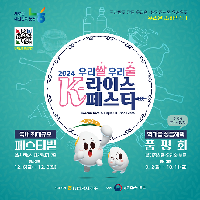 최종 수상작을 가장 먼저 만나볼 수 있는 곳은 ‘우리쌀·우리술 K-라이스페스타’ 페스티벌 현장이다. 12월6일부터 8일까지 3일에 걸쳐 일산 킨텍스 제2전시장 7홀에서 개최된다. 페스티벌에서는 수상작에 대한시상식과 더불어 250여 개의 다양한 우리술 및 쌀 가공식품 전시·판매·시음 행사가 예정돼 있다. 국산쌀로 막걸리 만들기, 황금쌀을 찾아라, 우리 농산물 푸드아트 대회, 내 마음을 받아酒 프러포즈 등 다채로운 행사도 진행된다.