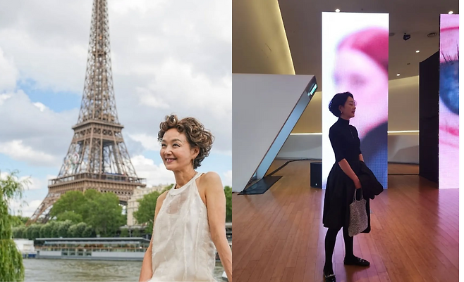 네 번째 사진에서 배종옥은 에펠탑을 배경으로 시스루 소재의 화이트 슬리브리스 톱을 착용해 로맨틱하고 자유로운 분위기를 연출한다. 자연스러운 컬 헤어와 밝은 미소가 프렌치 시크 감성을 완성하며, 여행지의 낭만적인 무드를 한껏 살리고 있다.