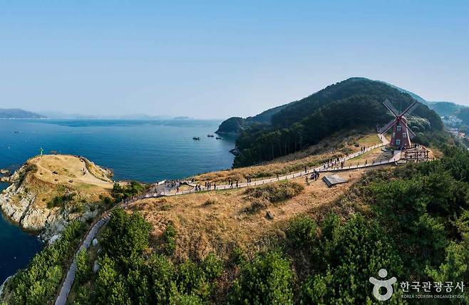풍차가 있는 언덕 정상: 이곳이 포토 스폿! 풍차 아래에서 바라본 도장포 마을과 에메랄드빛 바다 풍경은 거제 여행에서 절대 빼놓을 수 없는 순간입니다.
