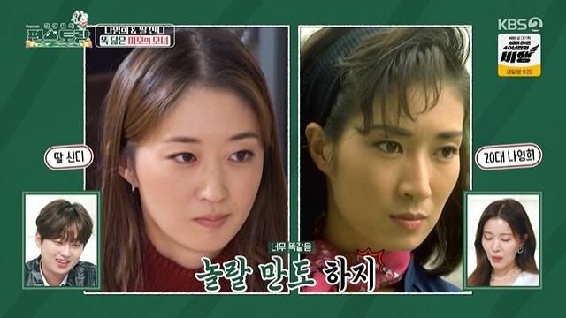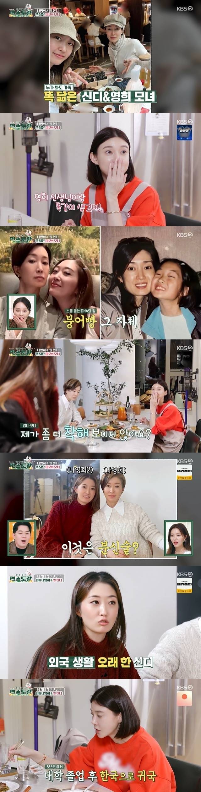 한편 신디는 엄마 나영희와 닮았다는 말에 "제가 좀 더 착해보이지 않냐"고 너스레 떨었다. 나영희는 "우리 맨날 서로 닮았다고 하면 (떨떠름해 한다)"고 밝힌 데 이어 "나는 몰랐는데 사람들이 닮았단다. 특히 나 20대 영화 보고 우리 매니저가 깜짝 놀랐다"고 주변의 반응을 전했다. 그러면서 공개된 20대 나영희와 신디의 외모 비교 사진은 감탄을 자아냈다.