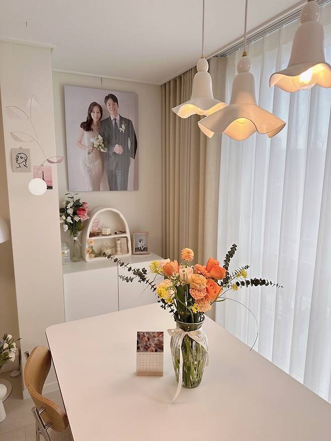 봄에 벚꽃이 만개한 집 앞을 바라보며 커피를 마실 때 카페 부럽지 않다! 라고 생각하는 공간입니다. 벽면에 저희 결혼액자가 걸려있는 곳에는 저렴한 인테리어 가구를 놓아도 예쁠 수 있게 꾸몄습니다.
