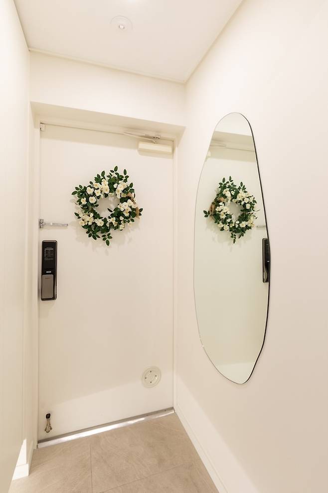 신발장의 화이트 베이지 느낌에 포인트로 화이트 그린 리스를 달아 놓았더니 집에 오시는 분들마다 입구부터 예쁘다고 해주십니다.