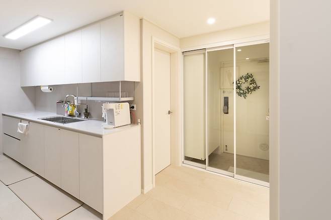 집의 평수가 작을 수록 깔끔한 인테리어가 돋보인다고 생각합니다. 지난 집에서는 중문을 반투명으로 하였는데 이번 집에서는 완전히 투명한 중문으로 제작하여 개방감을 주었습니다.
