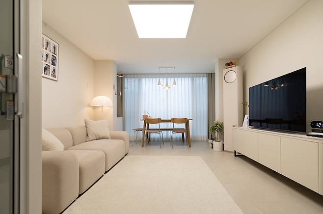 저희 집 거실입니다. 소파와 티비장은 모두 기존에 사용하던 가구를 활용해서 배치해두었어요. 체리빛 몰딩이 가득했던 공간이 밝고 환해졌어요.