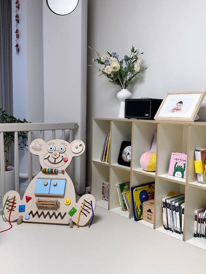 아기를 키우면서 거실이 아기가 노는 곳으로 바뀌게 되었는데 책장 속에도 예쁜 소품이 함께하니 찾아오시는 분들마다 '아기용품이 있어도 집이 정말 예쁘다!'라고 자주 칭찬해 주세요.