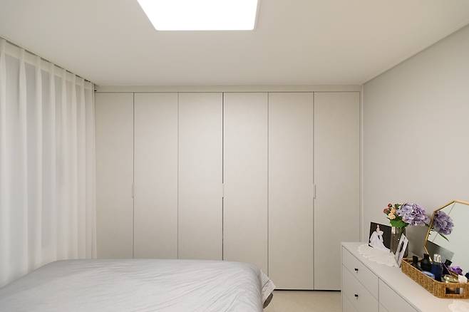 큰 방 벽지가 연한 그레이 톤이라 기존의 침대와 어울리는 색의 톤으로 도배했습니다. 좁은 느낌이 덜하도록 붙박이장도 연한 그레이 톤으로 심플하게 제작하였습니다.