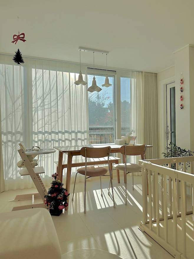저희 부부가 다짐했던 것이 '아기가 태어나더라도 우리의 삶도 살자!'였습니다. 아기가 있더라도 감성은 절대 놓칠 수 없죠! 거실의 쉬폰 커튼을 치면 스튜디오 분위기가 물씬 나는 포토존이 됩니다! 여기에서 아기와 예쁜 사진을 함께 많이 남기려고 노력합니다.