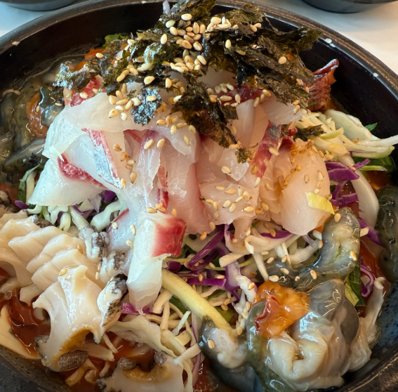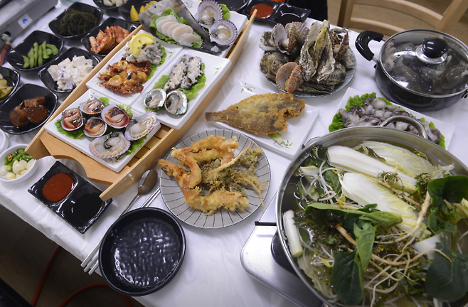 전복, 해삼, 멍게, 가리비 등 다양한 해산물을 한 번에 즐길 수 있습니다.