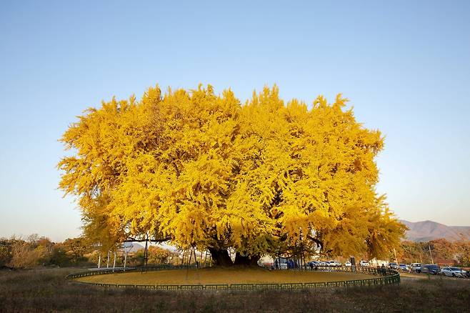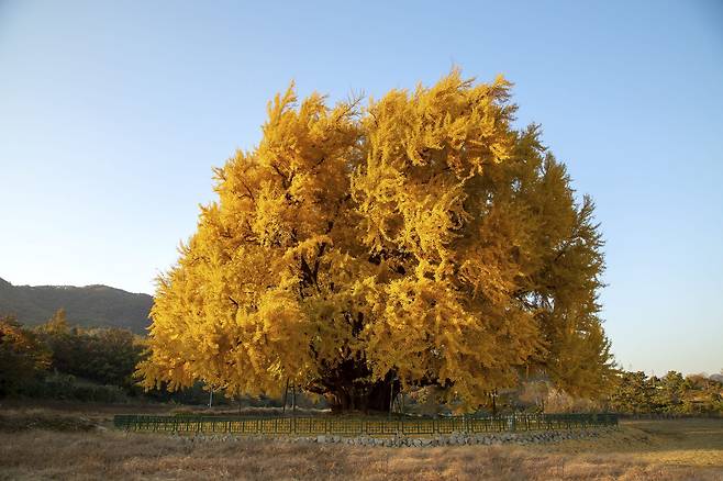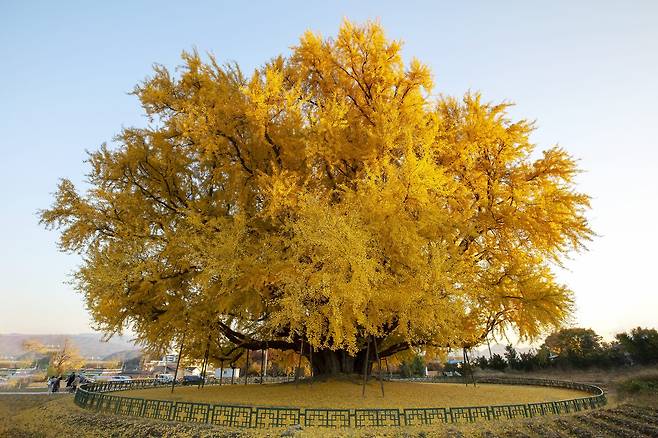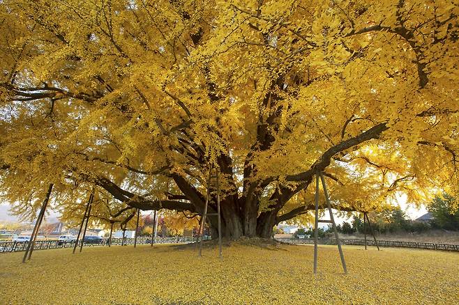 키 32m, 둘레 16.27m에 이르는 웅장한 규모는 한눈에 보아도 범상치 않은 아우라를 풍겨요. 두 팔을 활짝 펼친 듯 넓게 뻗은 가지는 마치 마을을 감싸 안는 듯한 모습이에요. 예로부터 반계리 은행나무는 흰 뱀이 산다는 전설이 깃들어 있고, 가을 단풍이 절정에 이르면 풍년이 온다는 믿음도 전해 내려오고 있어요. 그만큼 마을 사람들에게 신목(神木)으로 여겨져왔고, 세월이 흐르는 동안에도 사람들의 보호와 관심 속에서 꿋꿋이 자리를 지켜왔어요.