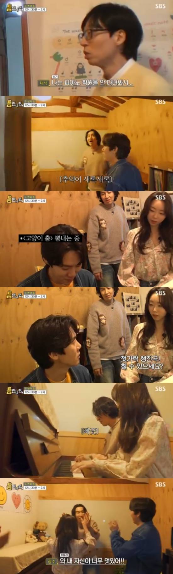 그러면서 유연석은 자신이 칠 줄 아는 '고양이 춤'을 냅다 연주했고, 이에 선생님은 '젓가락 행진곡'을 이야기했다. 하지만 유연석은 어떻게 치는 건지 알지 못했다. 그 때 이광수가 "제가 선생님과 함께 쳐봐도 되겠냐"면서 나섰다.