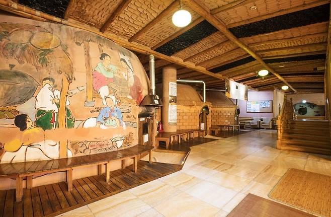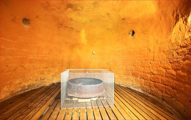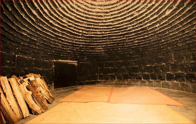 굴 형태의 불한증막(2층 높이 구조)에 앉아 있으면, 대지의 온기가 천천히 스며드는 느낌이 듭니다. 그래서 짧게 달아오르는 열이 아니라, 몸속 깊은 피로가 풀리는 ‘지속되는 따뜻함’이 남습니다.