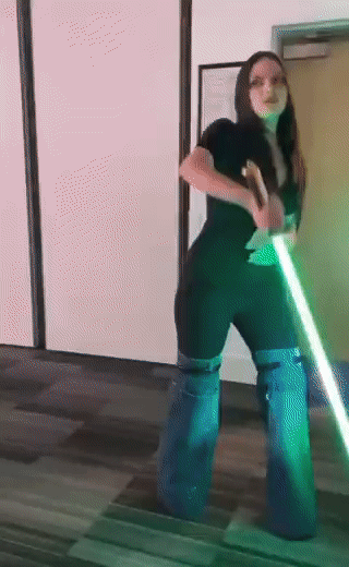 최근 미국의 온라인 커뮤니티 레딧에 다프네 킨이 라이트 세이버(광선검)을 멋지게 휘두르는 모습이 공개되어 팬들의 환호를 이끌어내기도 했습니다.