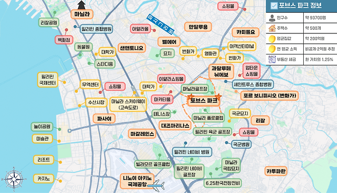 ‘포브스 파크’ 주변 인프라도 뛰어난 편이다. 동·서쪽에는 쇼핑 단지가 형성돼 있다. 서쪽 쇼핑몰은 백화점 밀집 지역이며 동쪽 단지는 공원, 서점, 수제 베이커리 등이 있는 번화가다. 남쪽으로는 유명 골프장들이 즐비해 있는데 대표적으로 △빌라모르 골프 클럽 △필리핀 네이비 골프클럽 등이 있다. 네이비 골프 클럽의 경우 필리핀 군(軍) 장성을 위한 전용 골프장이다. 다만 ‘포브스 파크’에서 조금만 벗어나면 필리핀의 현실과 마주하게 된다. 곳곳에 빈민가가 자리하고 있다. ‘포브스 파크’에 벽을 세우고 보안관을 24시간 배치한 이유이기도 하다. 가장 가까운 빈민가는 북쪽 게이트 인근에 자리하고 있다.