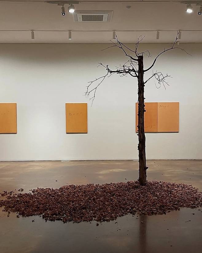 K2의 1층을 수놓은 '숲으로부터' 회화 연작은 매일 숲을 산책하는 작가의 일상을 담았다. 작가가 거주하는 교토의 동네 숲을 산책하며 다양한 낙엽과 꽃잎을 주워 모은 후, 이를 재료로 물감의 안료를 만들고 캔버스에 칠했다. 회화 표면에는 숲속을 거닐면서 들었던 바람소리, 새소리, 빗소리 등 다양한 소리도 들리는 그대로 음차해 흑연으로 적었다.