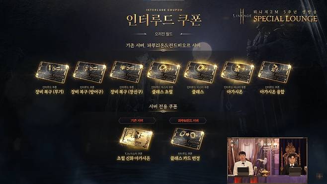 오리진 월드 이용자는 총 8장의 쿠폰을 받을 수 있다. 강화에 실패해 파괴된 '무기, 방어구, 장신구' 등 장비를 복구하고, '클래스/아가시온'의 합성 및 융합에 재도전할 수 있다. 기존 서버 이용자는 'TJ's 마스터 쿠폰 – 초월 신화 아가시온'을, 파푸리온과 린드비오르 서버는 '클래스 카드 변경' 쿠폰을 추가로 받는다.