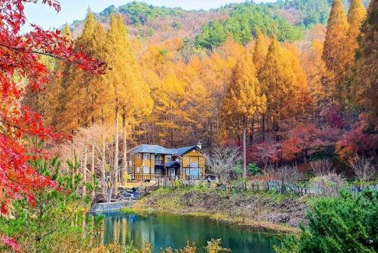 논산에 위치한 온빛자연휴양림은 가을이면 다양한 단풍 나무들이 화려한 옷을 입고 눈이 아플 정도의 눈부신 가을 장관을 연출합니다. 특히 빼곡한 메타세쿼이아 나무를 둘러싼 연못과 이국적인 건물은 마치 동화 속에 들어 온 듯한 신비로움까지 느낄 수 있습니다.
