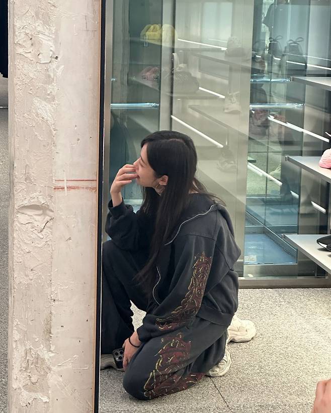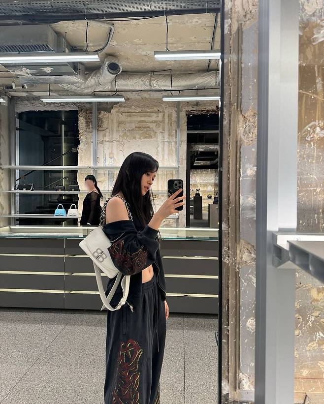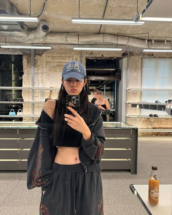 사진 속 노윤서는 블랙 크롭티와 무늬가 있는 그레이티 트레이닝팬츠와 자켓 셋업을 입고 힙한 코디를 자랑했으며, 또 다른 사진에서는 블랙 긴티와 베이지톤의 카고 팬츠를 입었다.