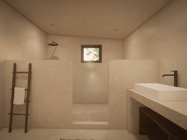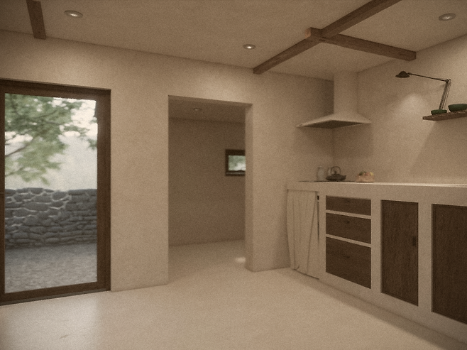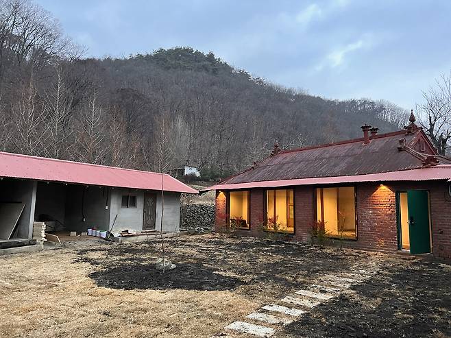 A. 내외부의 큰 시공은 모두 마친 상태예요. 외부 도색과 조경 작업 정도가 남았습니다. 수도사의 집이라는 맨끝집 콘셉트에 어울리면서도 건강하게 지낼 수 있는 집을 만들기 위해서 도배, 장판, 몰딩은 하지 않기로 결정했어요. 대신 천연 흙을 주재료로 해 이국적인 분위기를 내는 유럽미장이라는 방식으로 마무리하려고 해요.