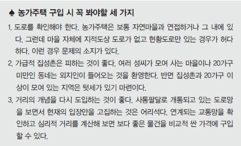 전원주택을 지을 때 자신이 만족하기 위해서는 정확히 어떤 집을 갖고 싶다는 구체적인 생각이 중요하다고 전문가들은 조언한다. 농가주택 리모델링을 하는 경우, 어떤 지역에 살고 싶은지 먼저 정하는 게 중요하다. 그리고 어떻게 보다 튼튼한 집을 매입할지 고민해야 한다.