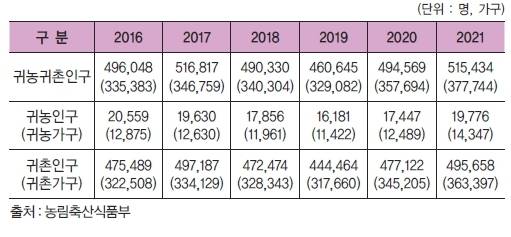 농림축산식품부가 실시한 ‘2022년 귀농귀촌 실태조사’에 따르면, 2021년 귀농귀촌 인구는 51만5432명으로 전년 대비 4.2% 증가했다. 귀농귀촌 가구는 37만7744가구로 전년 대비 5.6% 증가하며 귀농귀촌 통계조사 이래 최대치를 기록했다. 이번 조사에서 주목할 만 한 점은 60대 귀농귀촌 가구 수가 16.4% 증가하며 큰 폭으로 확대되는 모습을 보였다는 것이다.