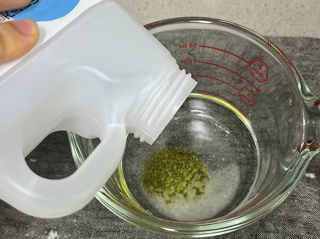 여기에 베이킹소다 1스푼을 추가합니다. 베이킹소다는 약알칼리성 물질로 기름기 제거에 도움이 됩니다. 또한 탈취와 세균 번식을 억제합니다.