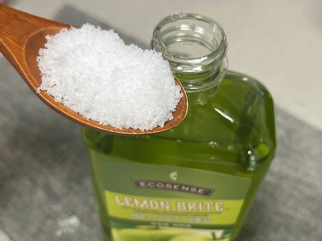 굵은소금 또는 꽃소금을 1스푼 넣습니다. 소금은 천연 재료로서 살균 및 항균 효과가 있습니다. 뿐만 아니라 기름기와 찌든 때 제거에도 도움이 됩니다.