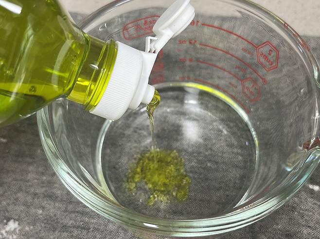 넣은 재료를 모두 잘 섞어 주세요. 골고루 저어 소금 결정이 사라질 수 있게 만듭니다.