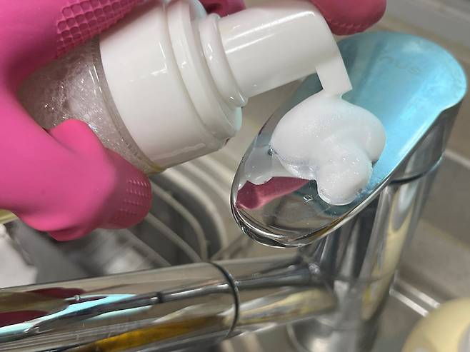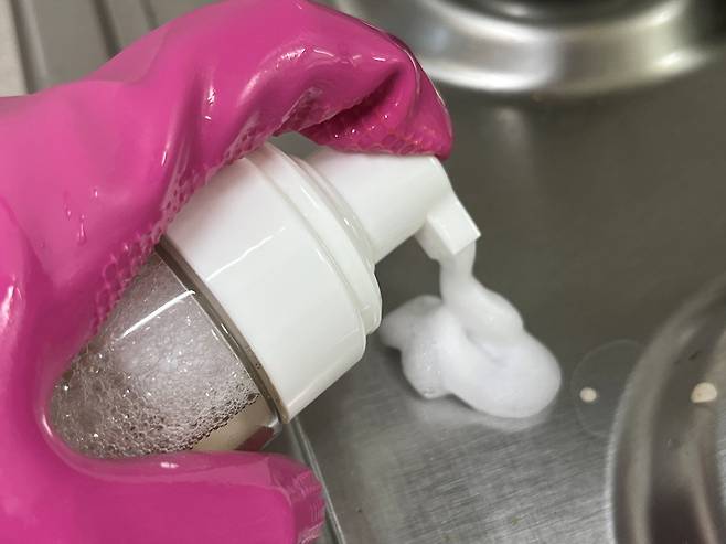 펌핑 용기에 넣어서 짜면 거품 형태로 나옵니다. 주방 싱크대 수전, 싱크대 청소 등에 활용해 보세요.