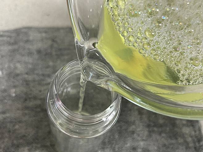 이렇게 만든 만능 세제는 펌핑 용기에 옮겨서 담으세요. 그래야 나중에 사용할 때 편합니다.